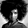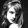 Description: portrait in black and white of a modelesque looking person with blondeish wavy hair and distinctive eyes and eyebrows.