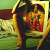 Description: cartoonic photomanip of my face (with some body) against a colourful patterned background